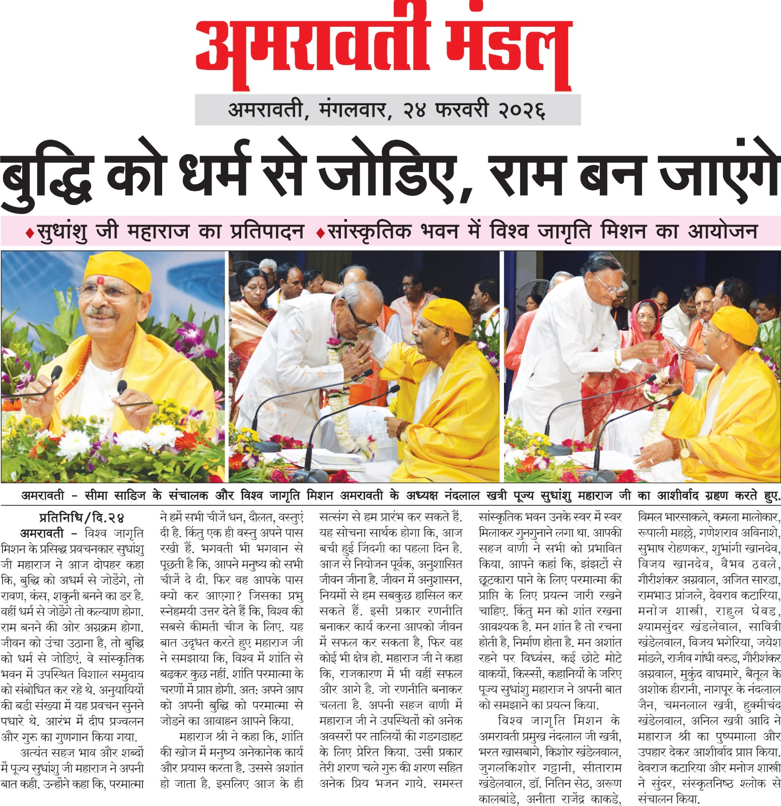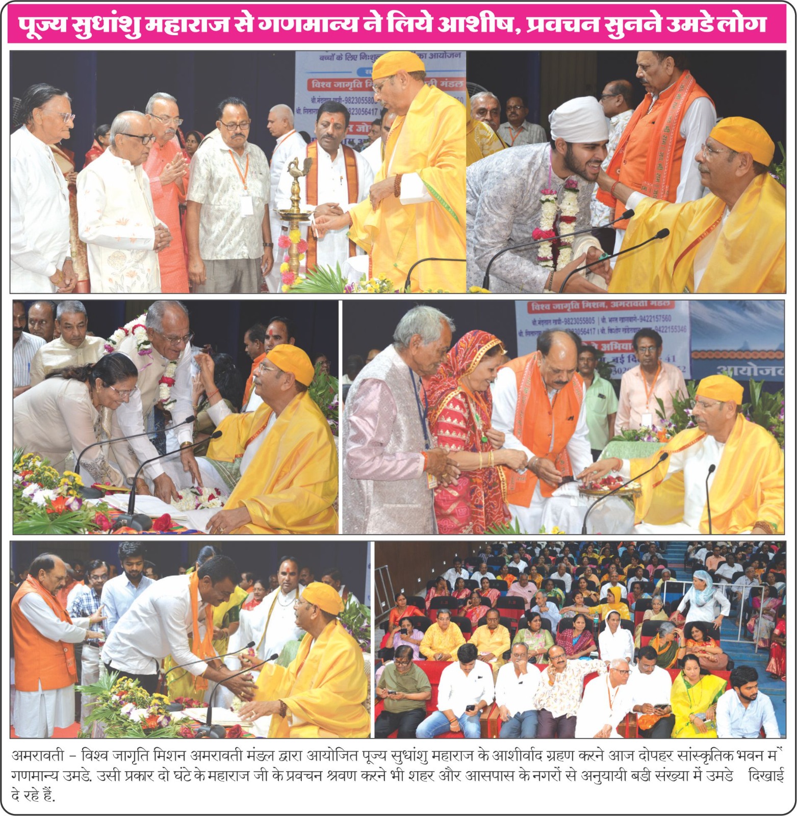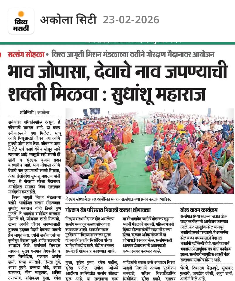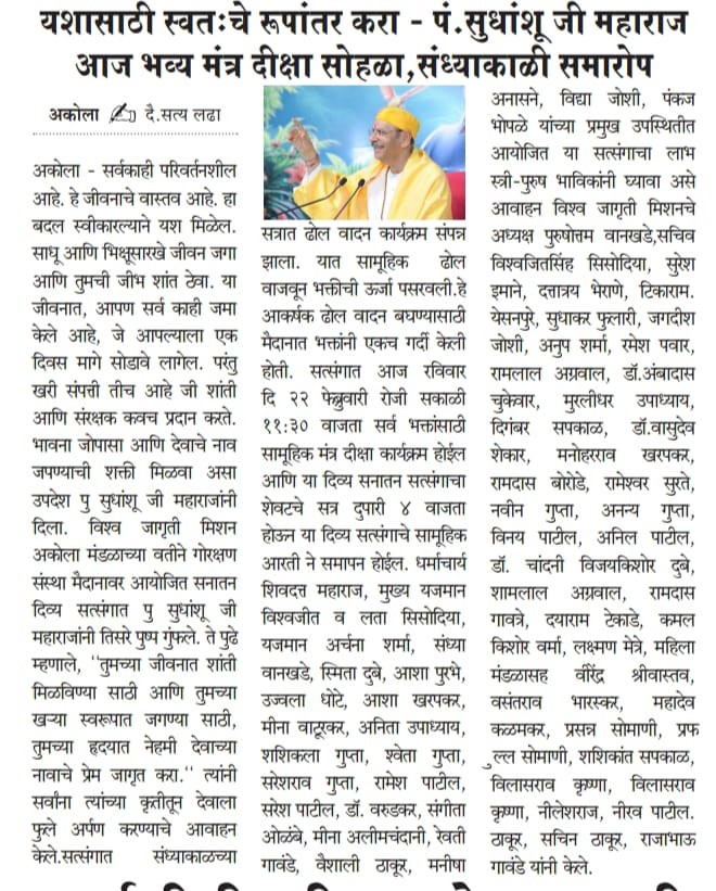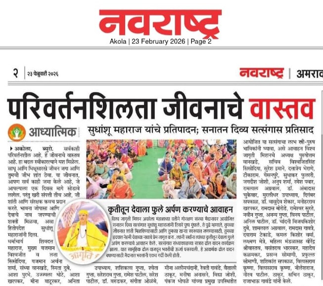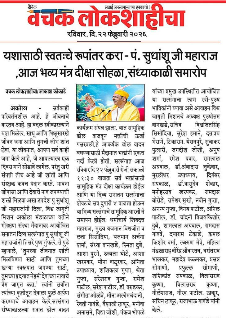 At the Vishwa Jagriti Mission event held at the Cultural Building in Amravati, Sudhanshu Ji Maharaj shared inspiring thoughts on life management. He said that if a person channels their intellect in the right direction, they can elevate their personality to great heights. Self-control, discipline, and regular practice of good habits are the keys to success. He explained that giving up bad habits requires consistent effort and at least 40 days of practice. Adopting positive habits brings lasting change in life. A large number of devotees attended the event, and everyone pledged to develop their personality and self-improvement.