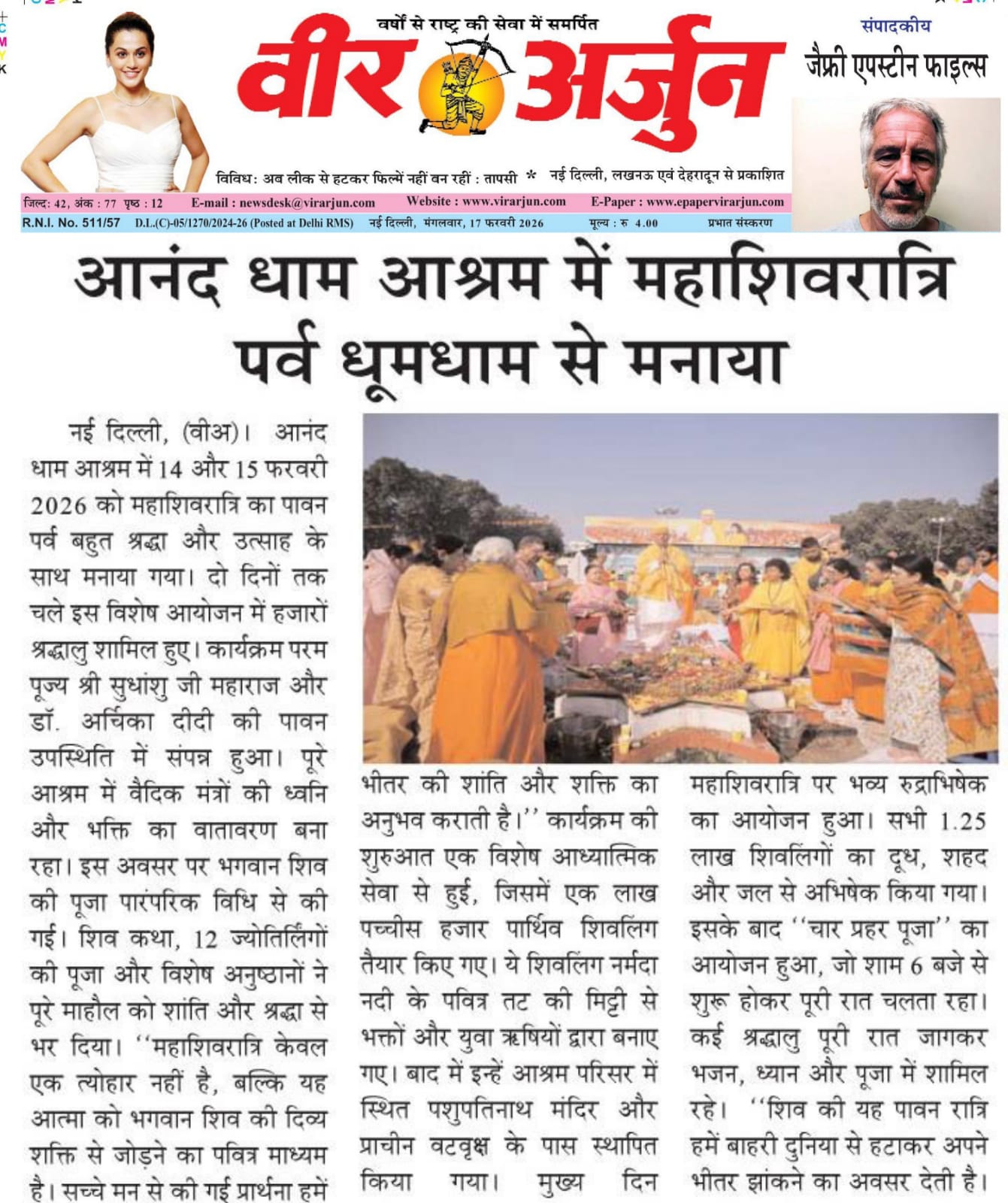 Mahashivratri 2026 was celebrated with immense devotion and spiritual fervor at Anand Dham Ashram, New Delhi, on February 14 and 15. The sacred two-day event witnessed thousands of devotees participating in traditional rituals in the divine presence of Param Pujya Shri Sudhanshu Ji Maharaj and Dr. Archika Didi. A remarkable spiritual highlight was the preparation and consecration of 1.25 lakh Parthiv Shivlings crafted from holy Narmada soil. The grand Rudrabhishek ceremony and rare Four Prahar Puja continued throughout the night, filling the ashram with Vedic chants and divine energy. The celebrations, also featured in Vir Arjun newspaper, reflected deep faith, unity, and spiritual awakening among devotees honoring Lord Shiva.